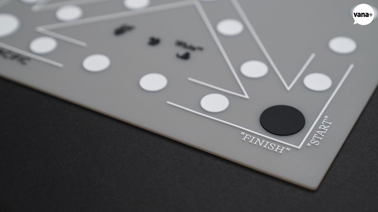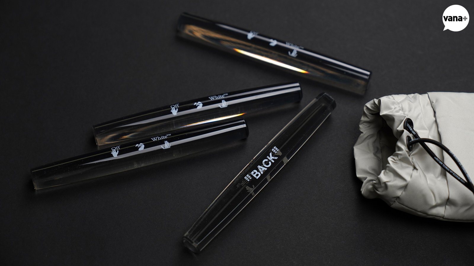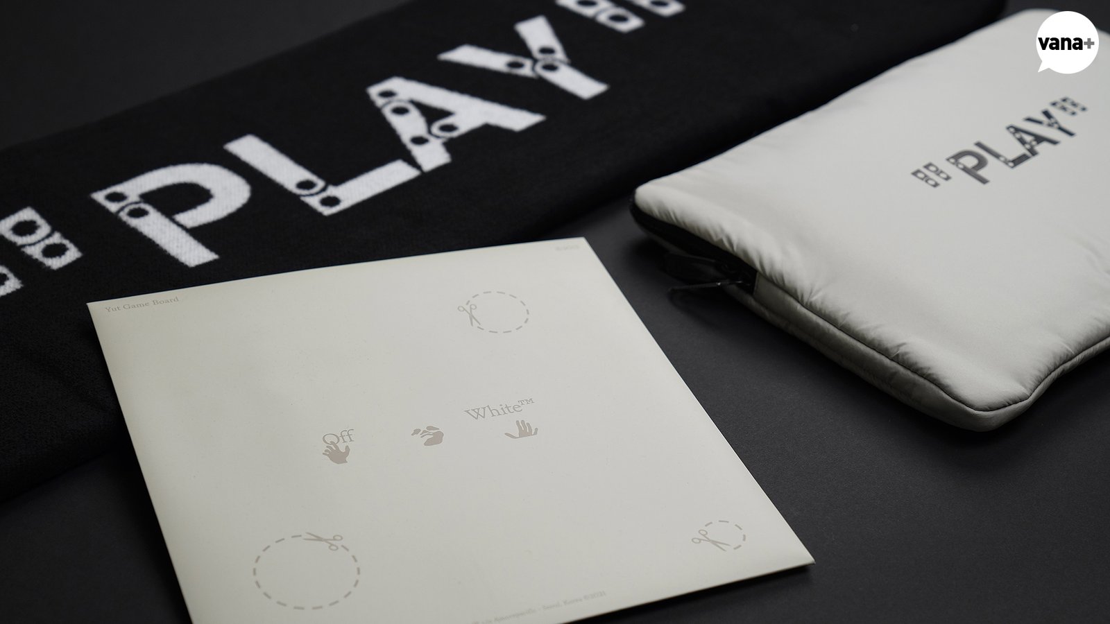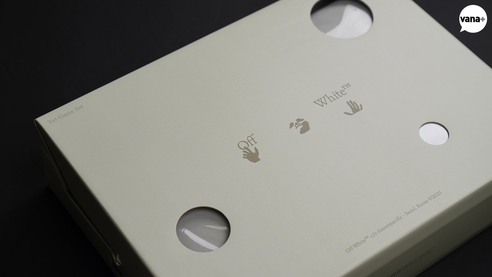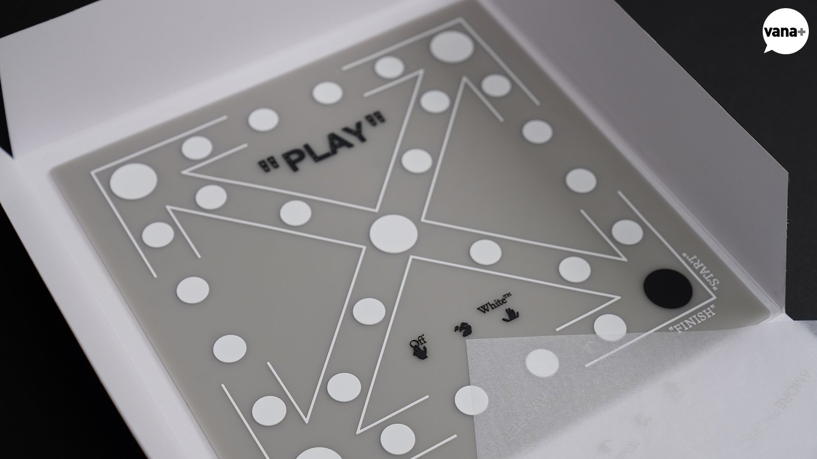 LP 패키지처럼 생긴 종이봉투를 열자 등장하는 OFF-WHITE의 X자 애로우 로고의 윷판이 모습.