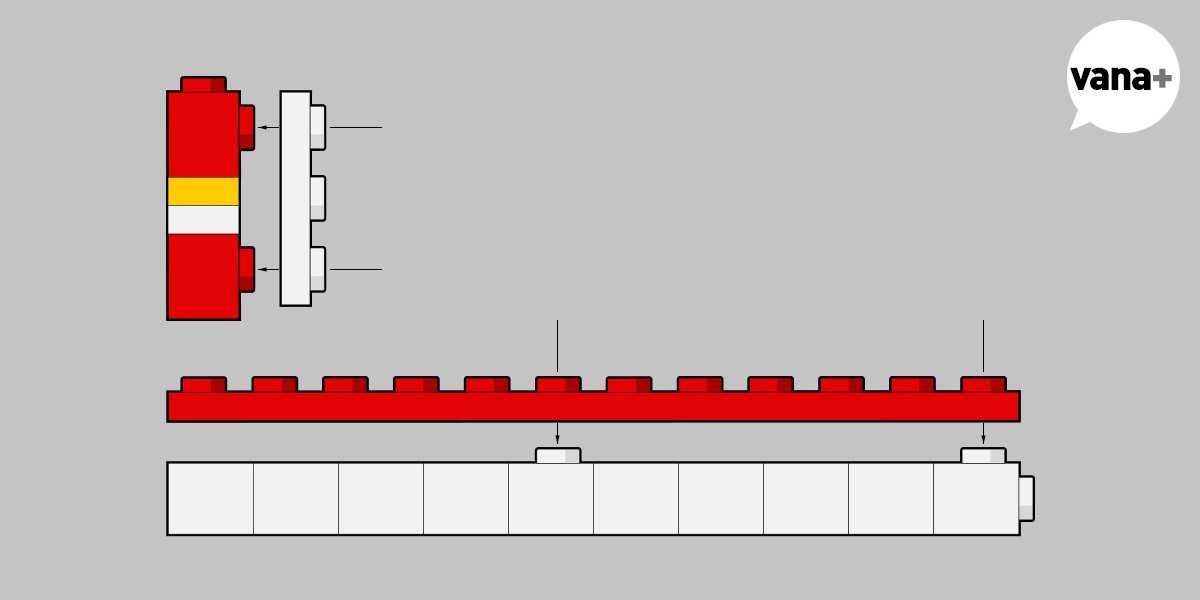 사이드 스터드 브릭 2개 사이에 일반 높이의 브릭(24 LDU) 4개를 추가하면 측면의 스터드 간격이 일반 브릭과 일치.