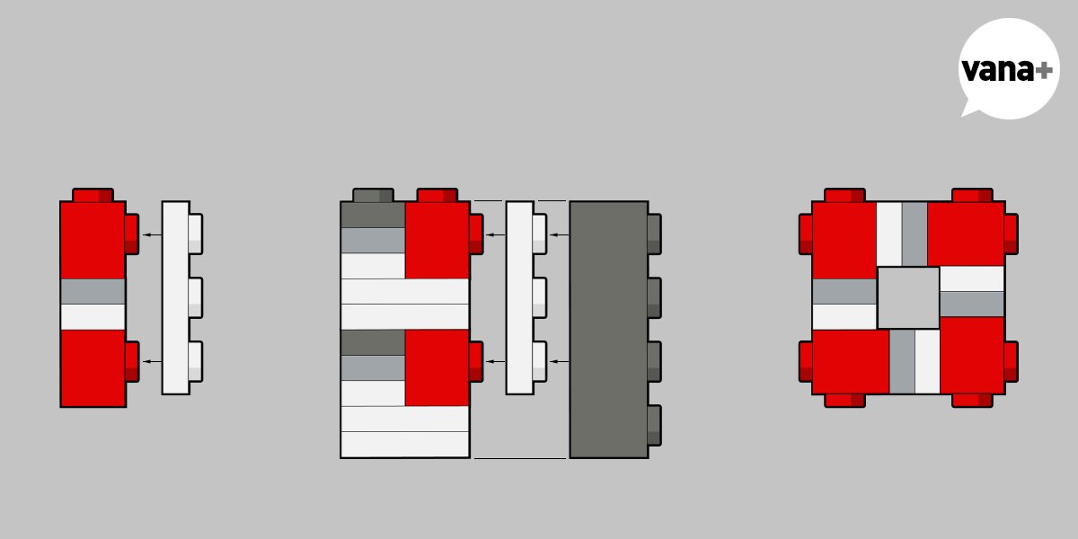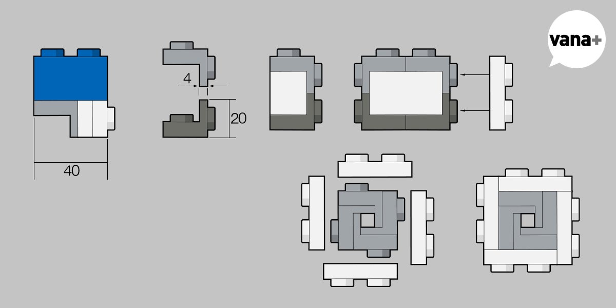 가장 우측 이미지처럼 양쪽으로 스터드가 달린 브릭을 이용하면 간단히 4방향으로 스터드가 달린 사각형을 만들 수 있는데, 4방향 스터드 브릭을 활용한다면 굉장히 견고한 큐브 형태도 만들 수 있다.