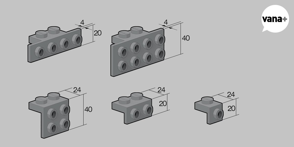 예시 이미지에는 플레이트에서 세로 면이 내려가는 형태의 기본형 브래킷만 있지만 플레이트 아래쪽에서 세로 면이 위로 세워진 반대 형태의 브래킷도 거의 비슷한 빈도로 사용되며, 실제로 조립 시에는 두 가지를 함께 사용하는 경우가 많다.