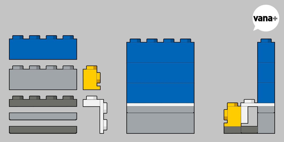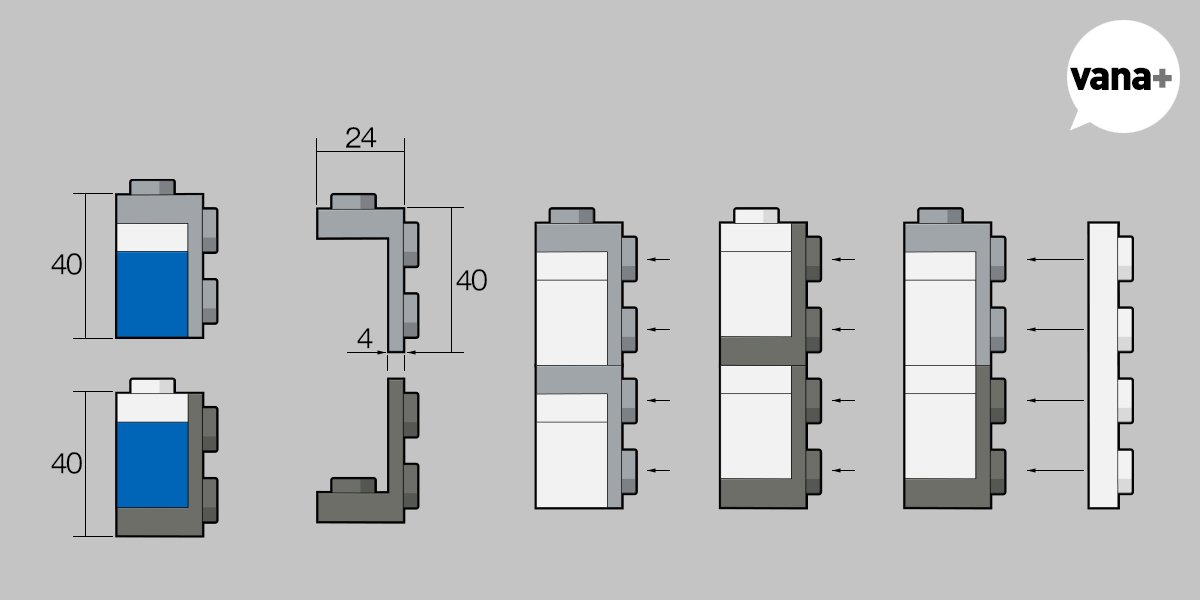 위쪽의 이미지에서 보여지는 바와 같이 SNOT 브래킷 부품의 4 LDU 두께와 적절히 조합하면 수직면 사이에 높이를 정확히 맞출 수 있다.