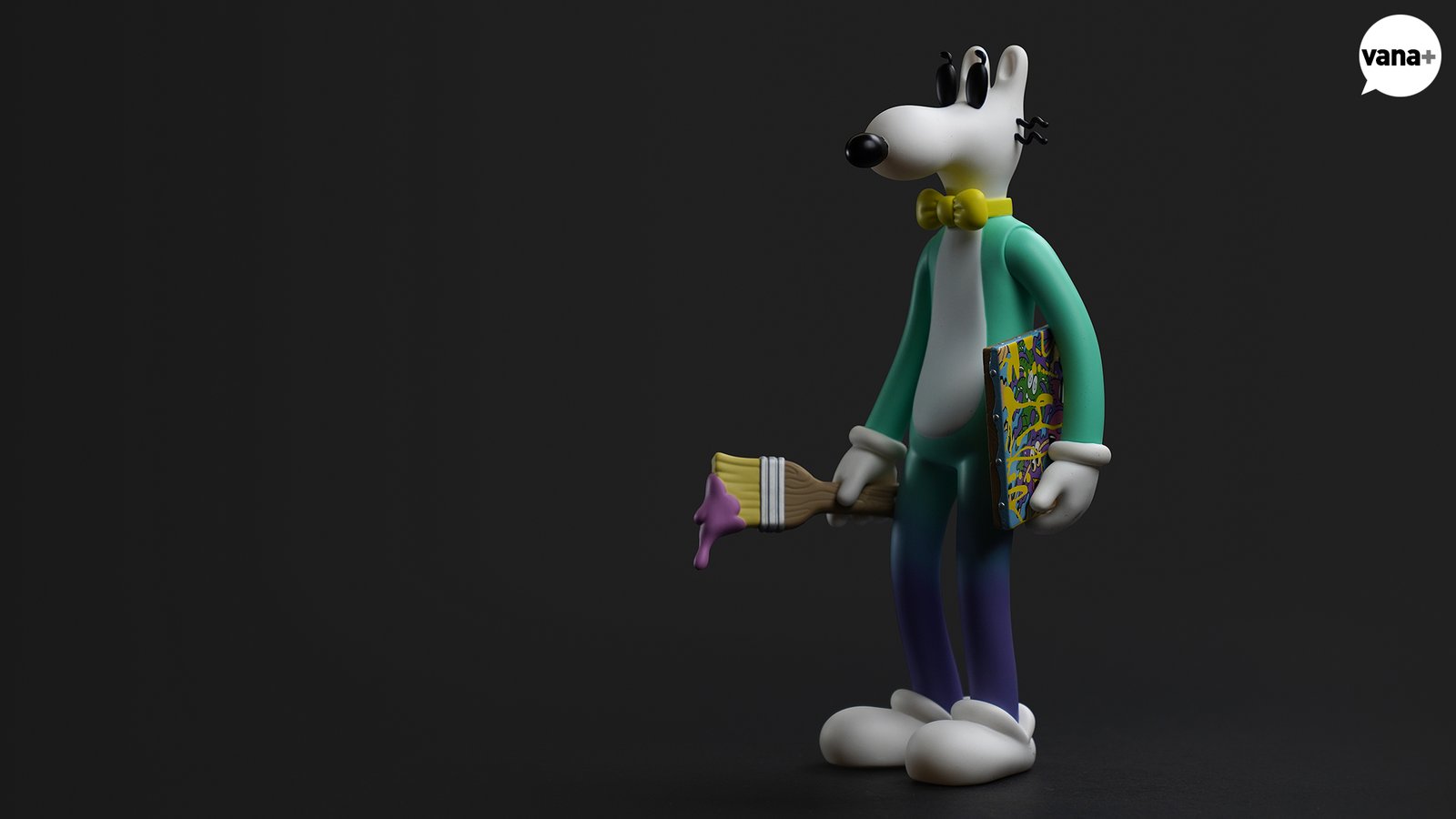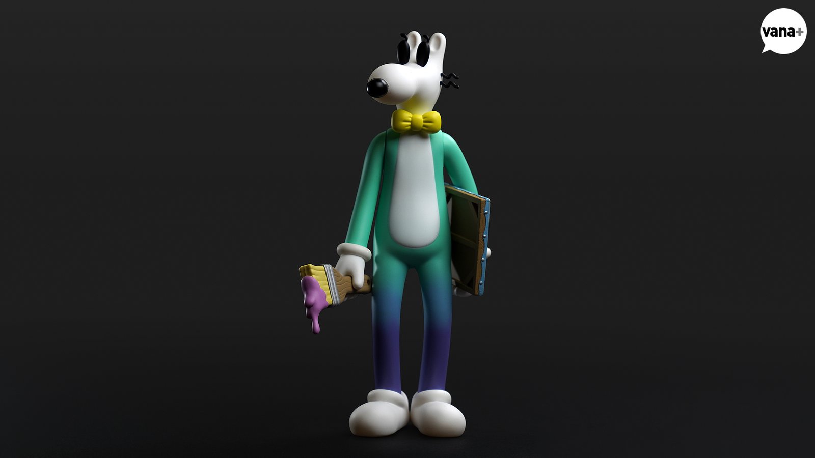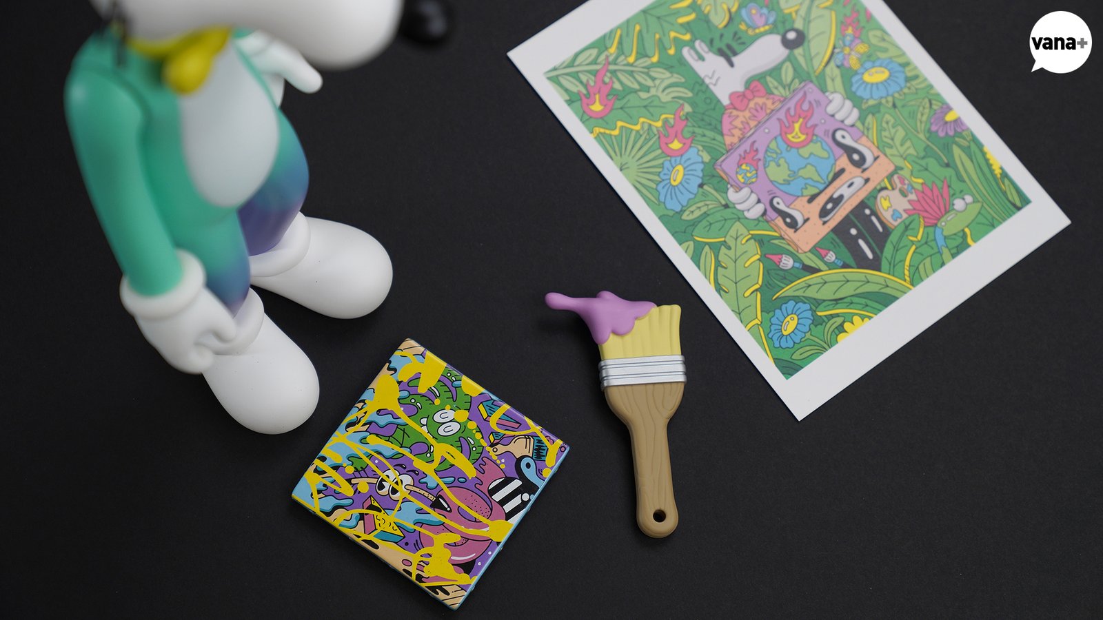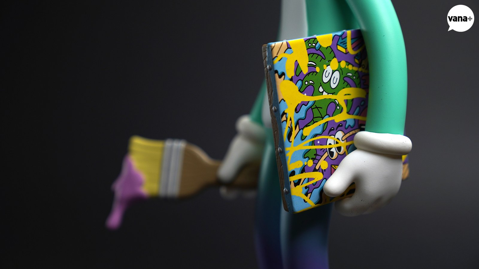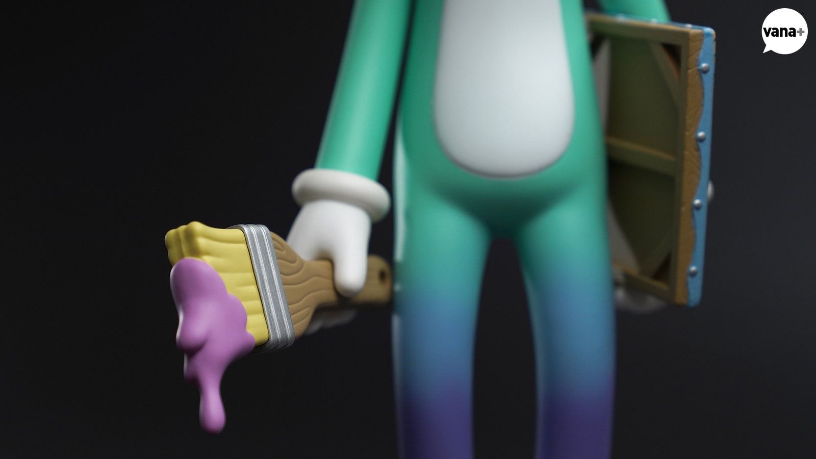 한 손에는 연보라색 물감을 잔뜩 묻힌 브러쉬가, 또 한쪽에는 노란색 물감이 마구 흐른 캔버스 위 그림 작품이 들려지게 된다.