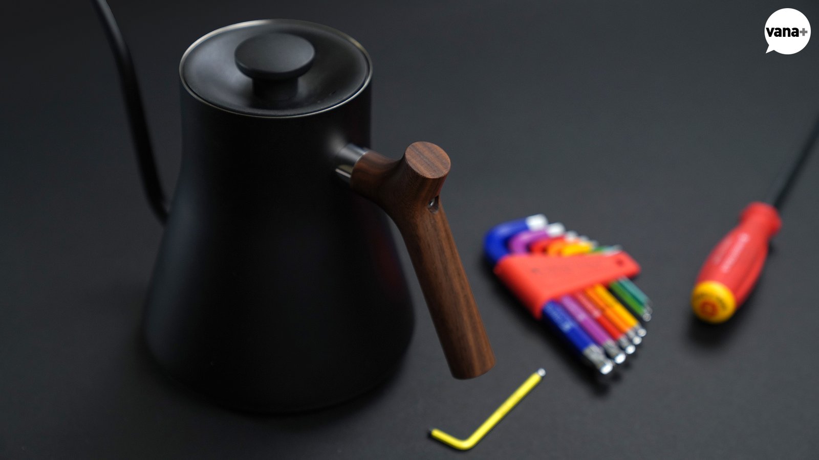 우드 핸들을 튀어나온 부분으로 단단히 밀어서 끼워 넣은 후 육각 렌치를 이용해 동봉된 조임 나사를 돌려 고정하면 끝.