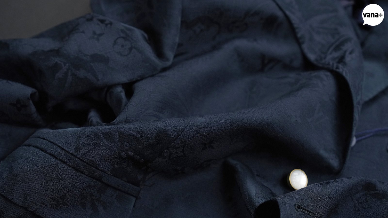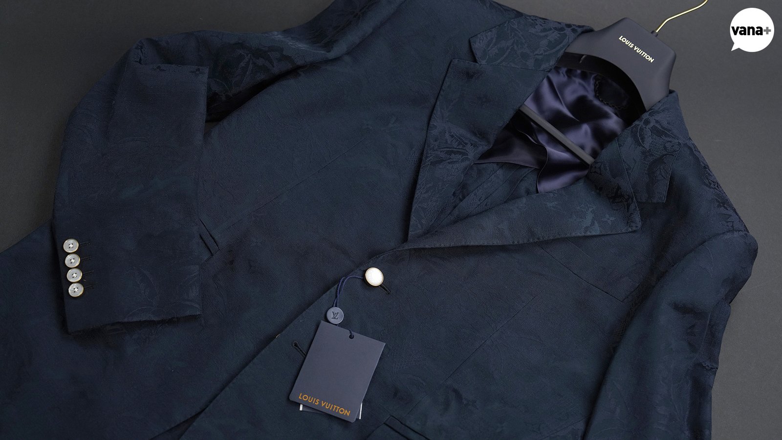 하의와 마찬가지로 톤온톤의 모노그램 팜 트리 자카드 패턴의 네이비블루 재킷이다.