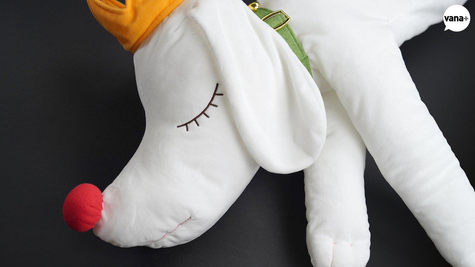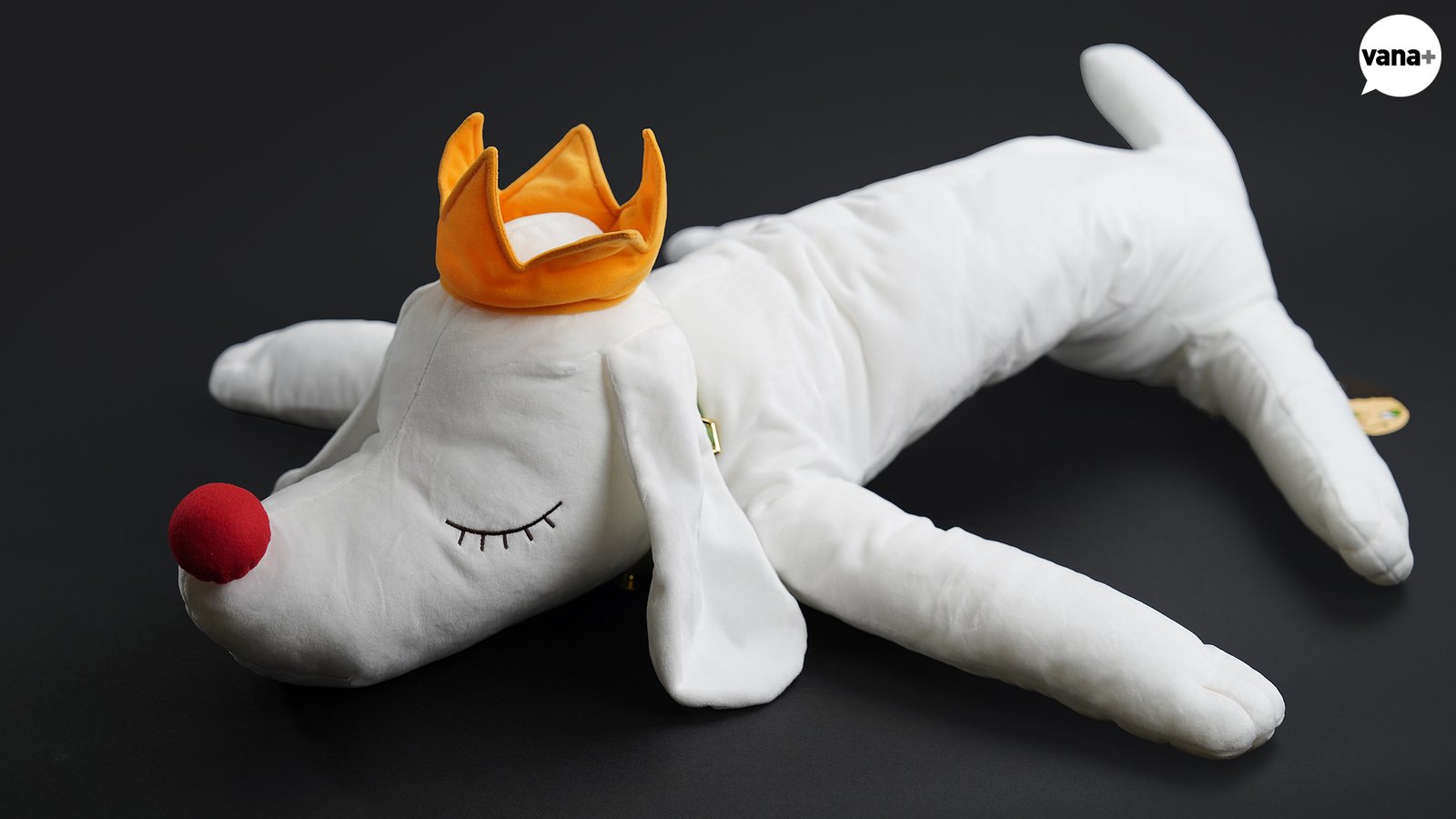 어디에도 정확한 설명은 없지만 자고 있어서 그런지 Sleepwalking Dog(몽유병 강아지), Crown Dog(왕관 강아지) 등으로 불리는 이 강아지 인형은 굉장히 부드러운 하얀색 천 재질의 봉제인형이다.