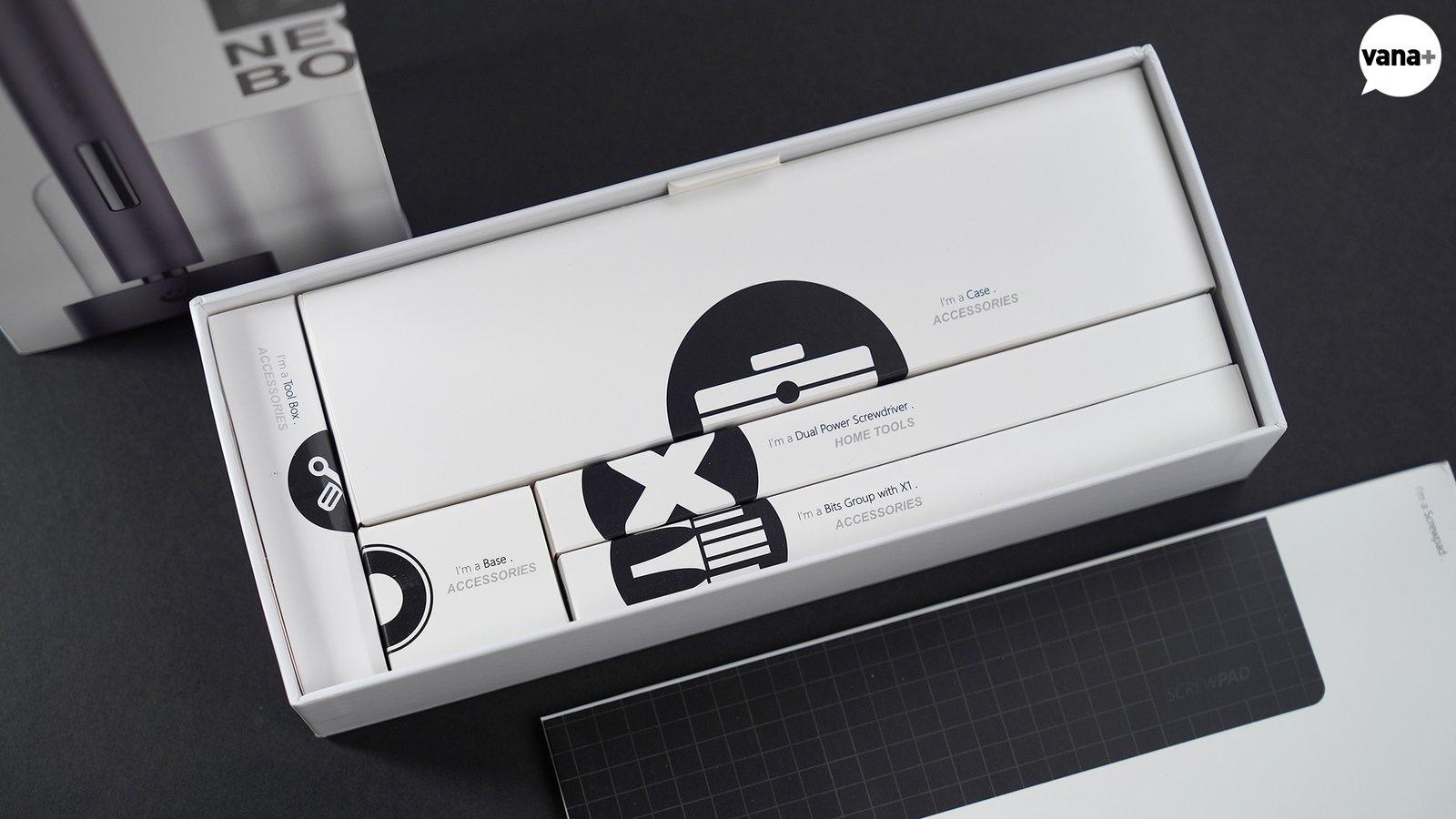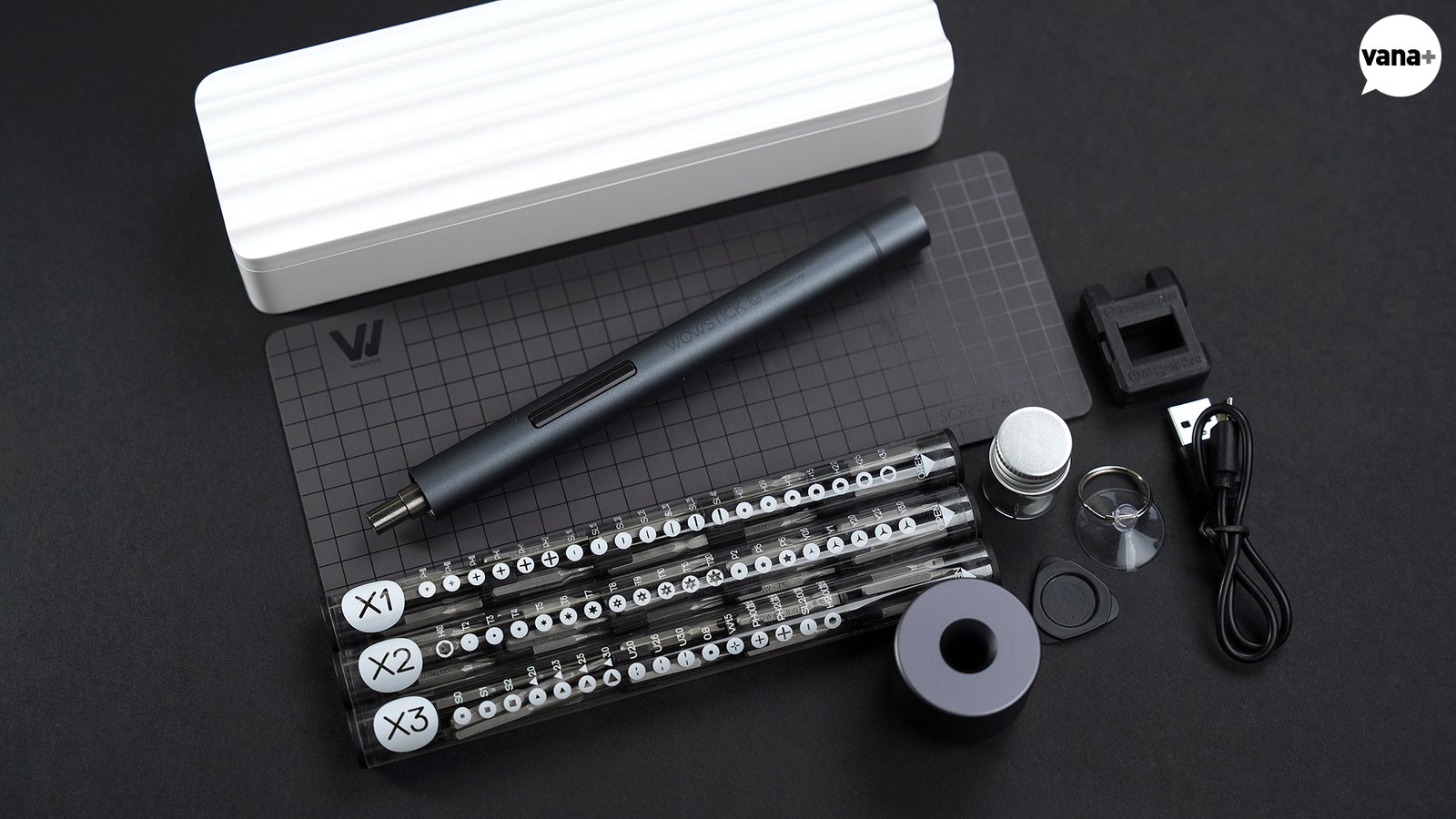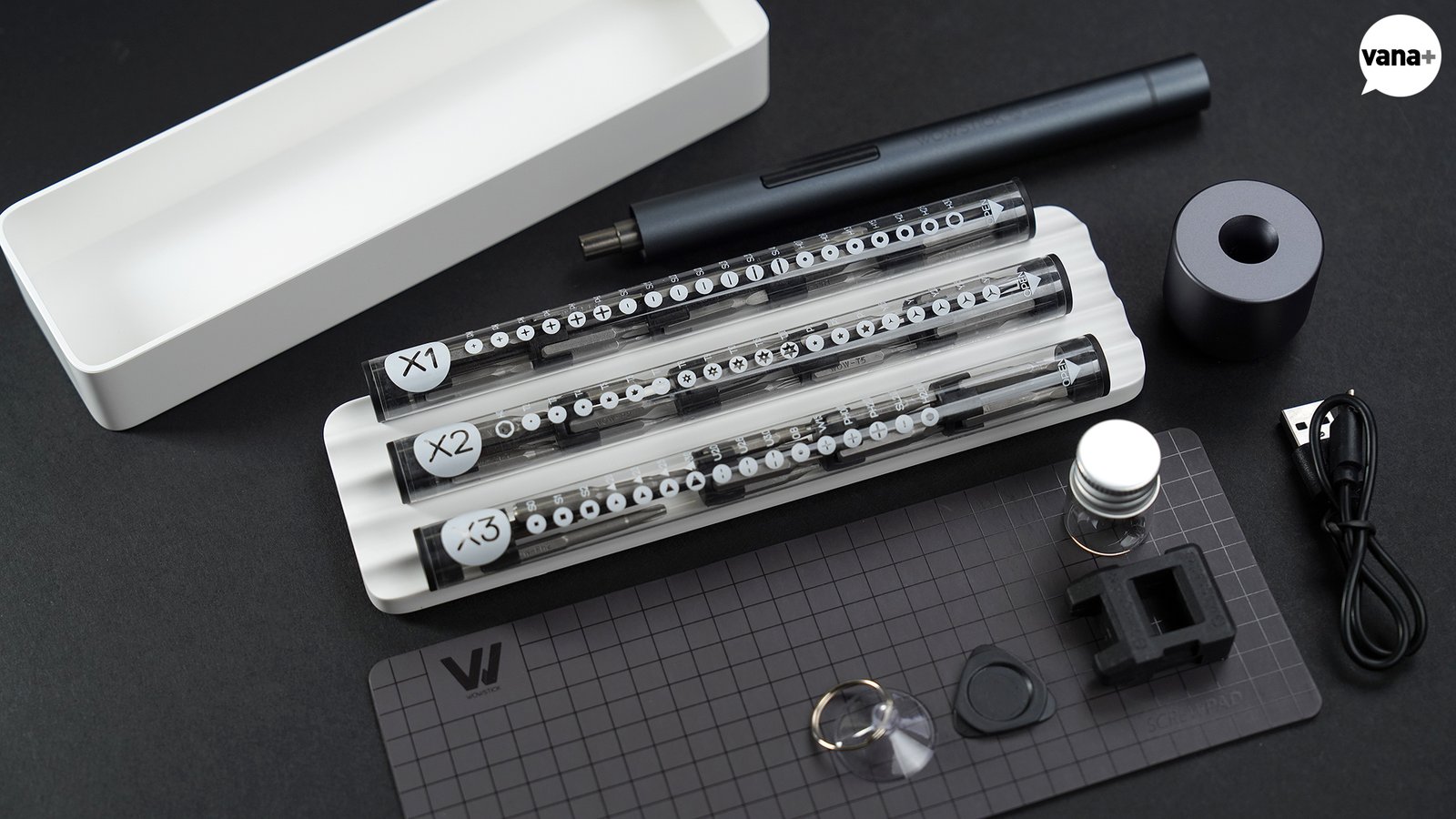 작은 푸품이나 나사 등을 보관할 수 있는 뚜껑 있는 투명한 유리병, 기타 연주하는 픽 같은 형태의 틈을 벌리는(?) 용도로 보이는 삼각형 툴, 링이 달린 소형 흡착기(sucker), 그리고 자화기(magnetizer), 그리고 USB-A to C 케이블이 포함되어 있었다.