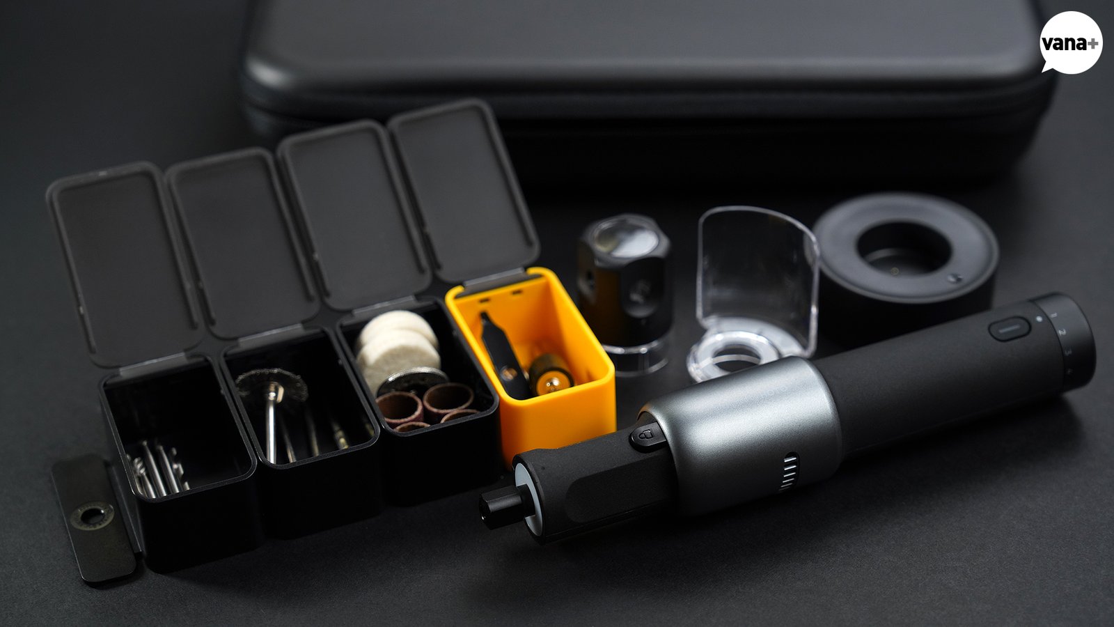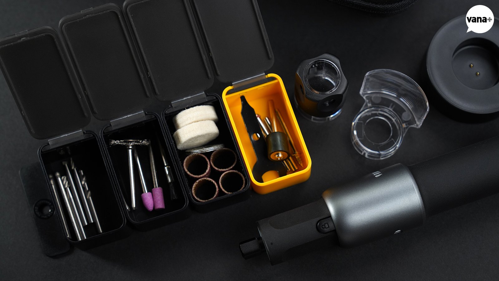 각각 분리되는 작은 케이스 네 칸에 카빙(carve), 샌딩(sand), 그라인딩(grind), 커팅(cut), 폴리싱(polish) 등의 용도를 위한 다양한 액세서리들이 들어있고, 안전을 위한 투명한 먼지 커버(dust cover)와 원형 충전 베이스 스탠드가 포함되어 있다.
