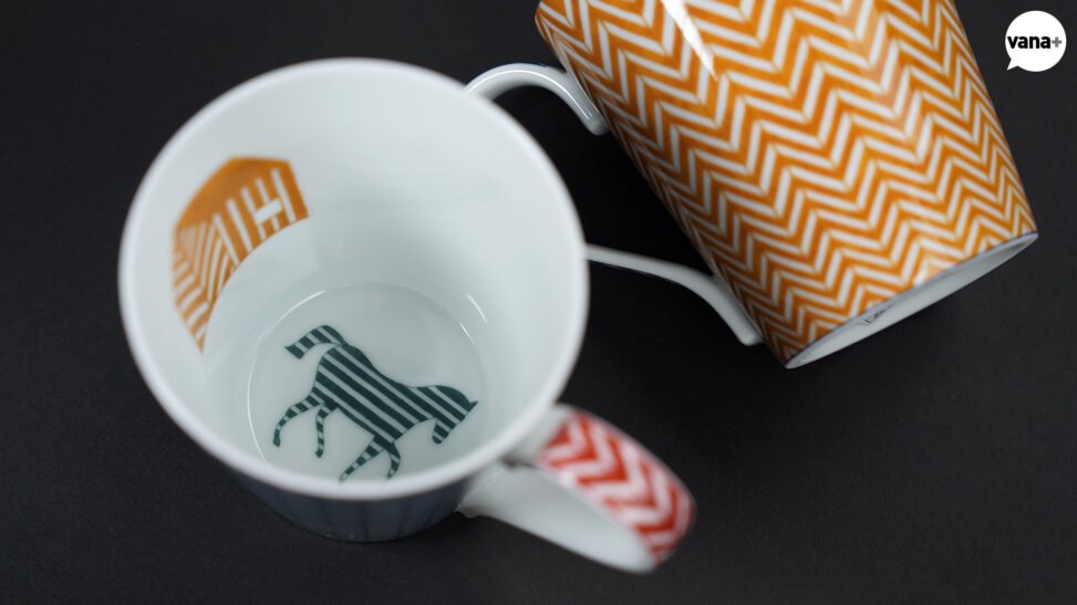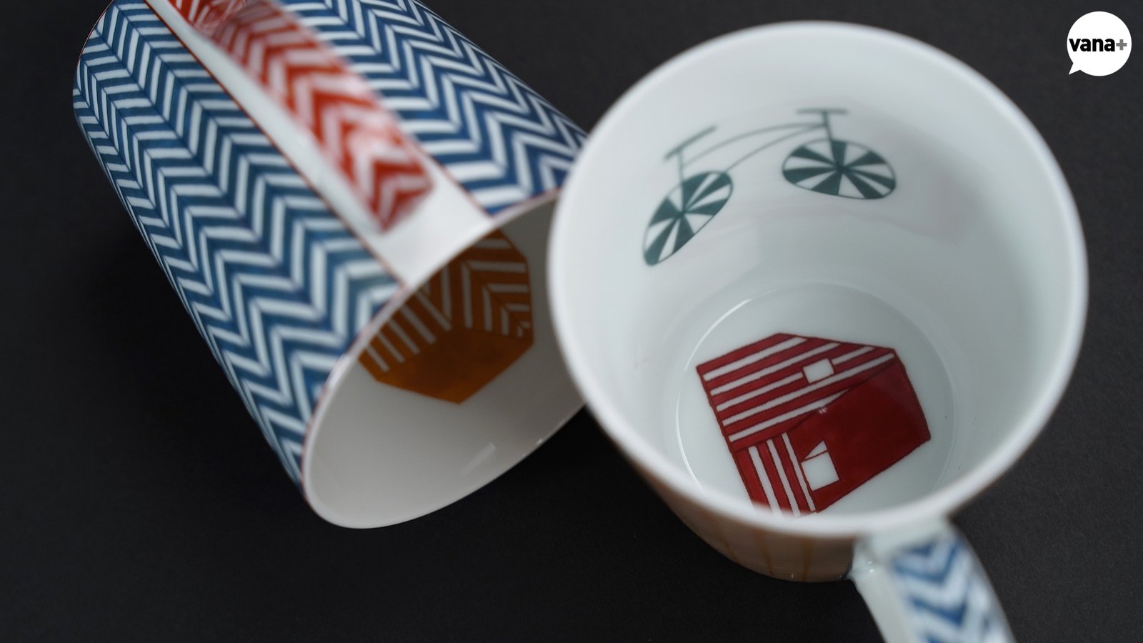 두 개의 컵 안쪽에 알록달록하면서도 심플 패턴이 곁들어진 오두막과 말, 그리고 자전거가 그려져 있는 모습.