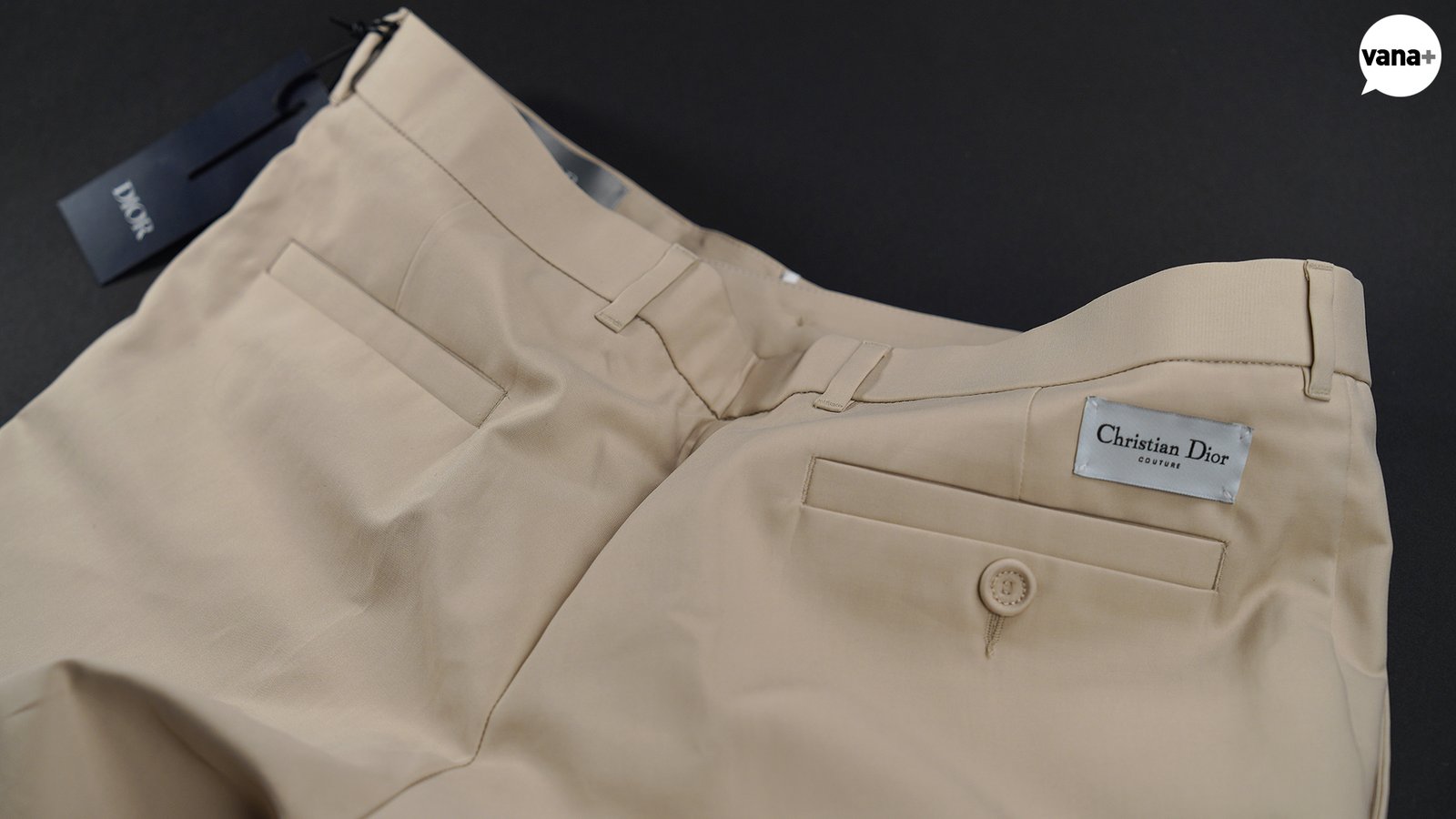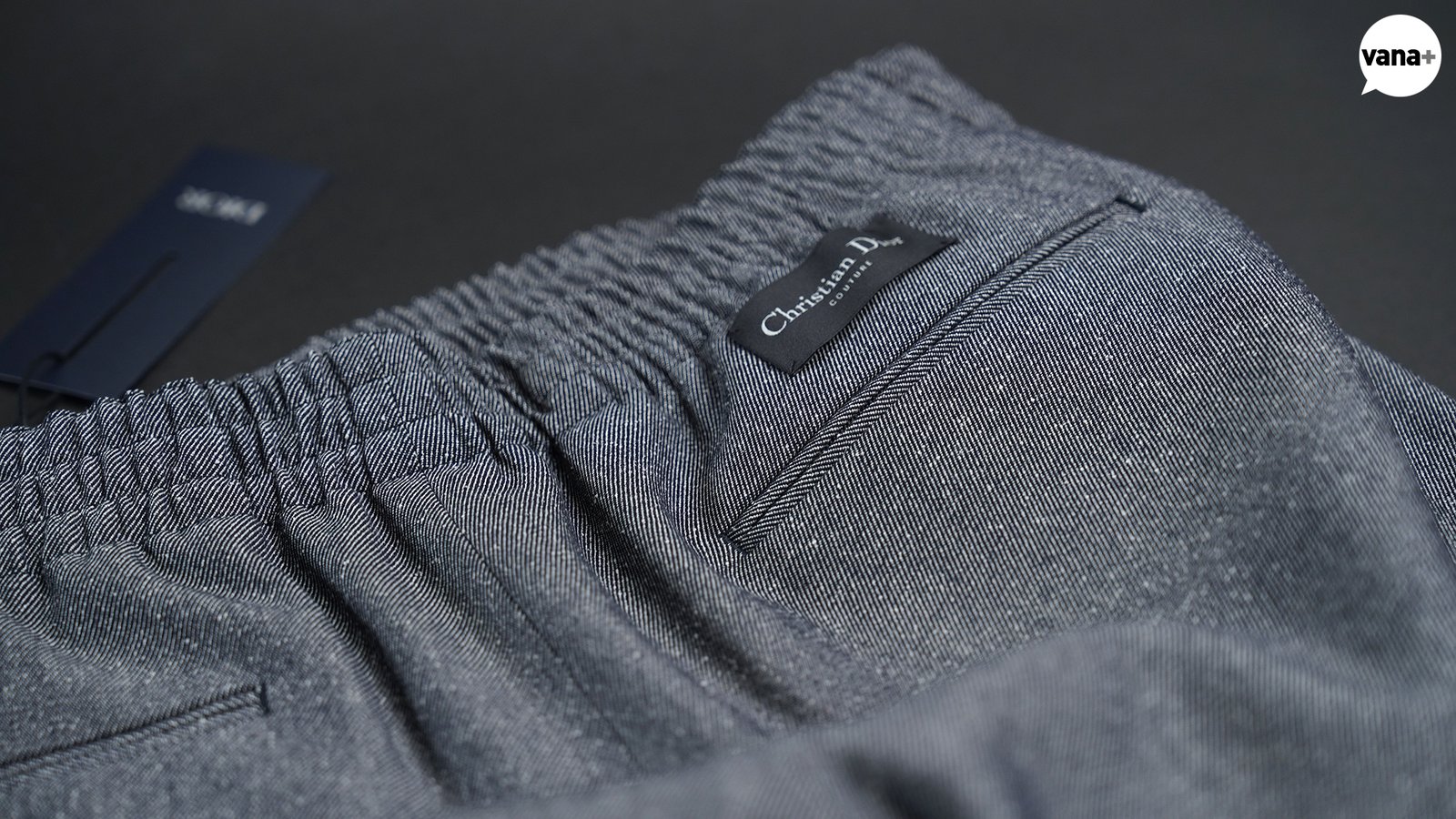 슬릿 사이드포켓에 웰트 뒷주머니, 그리고 그 위쪽으로 꾸뛰르 로고.
