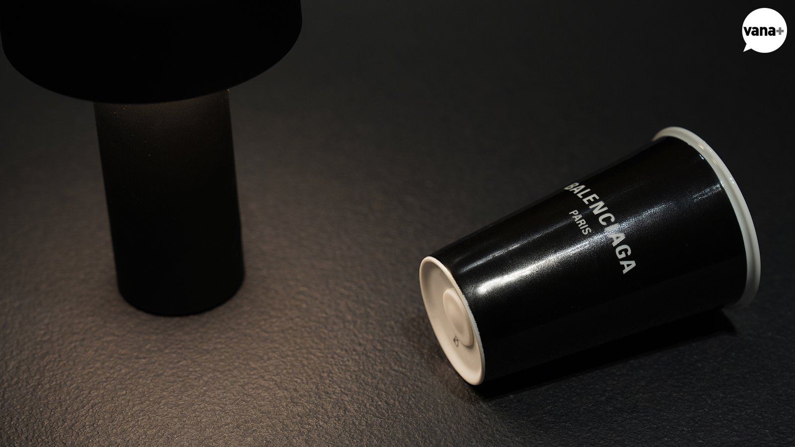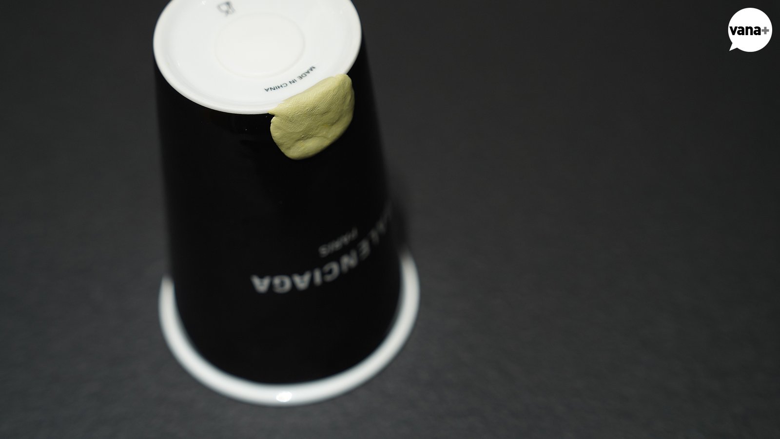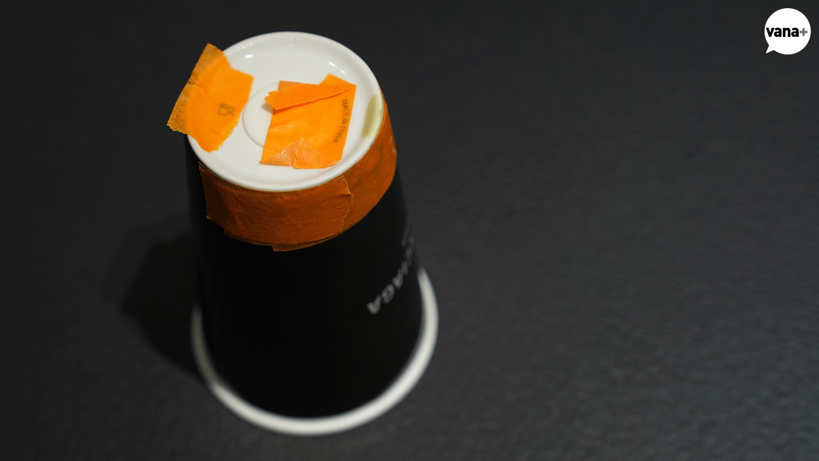컵 재질은 포슬린(porcelain), 뚜껑은 열가소성 엘라스토머(Thermoplastic Elastomer, TPE)와 폴리프로필렌(Polypropylene)이며 디자인은 일반적인 카페의 커피 컵 모양.