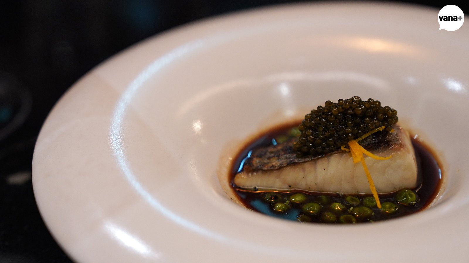 삼치구이, 홍게소스, 완두콩, 어린 고수, 오렌지 껍질