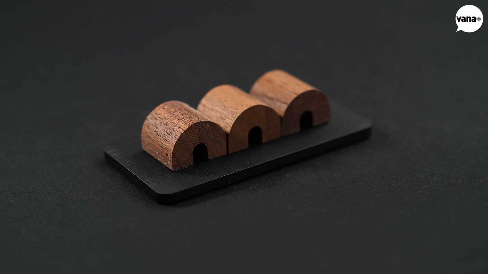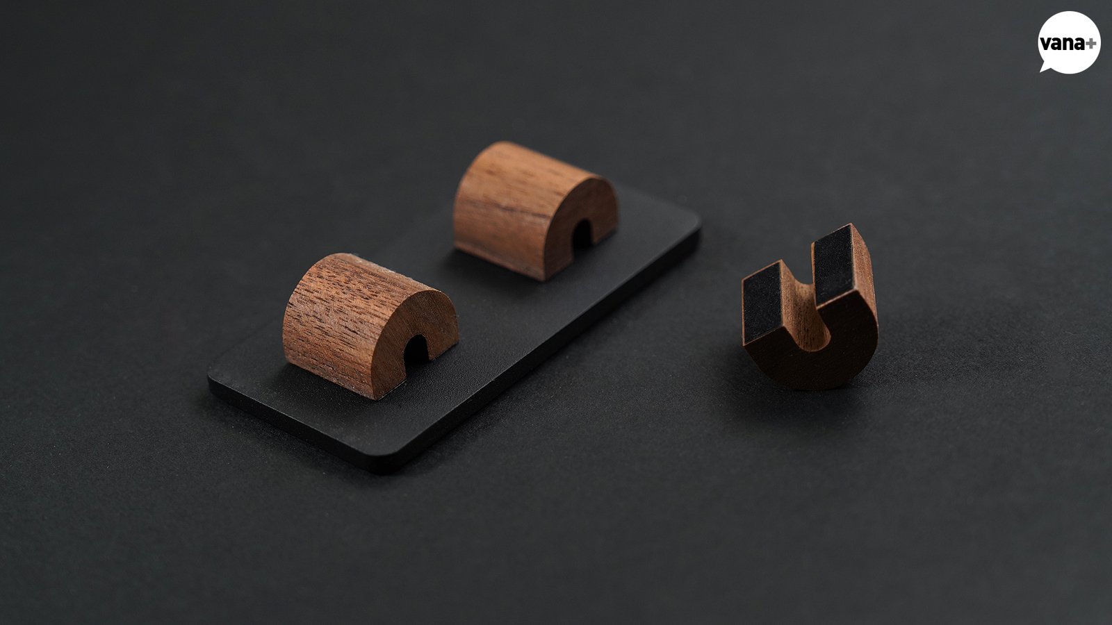 (w) 9.6cm x (d) 4.8cm 의 금속 플레이트 위에 월넛 원목으로 만들어진 U자 모양 부품이 케이블을 잡아주도록 만들어진 간단한 정리 도구.