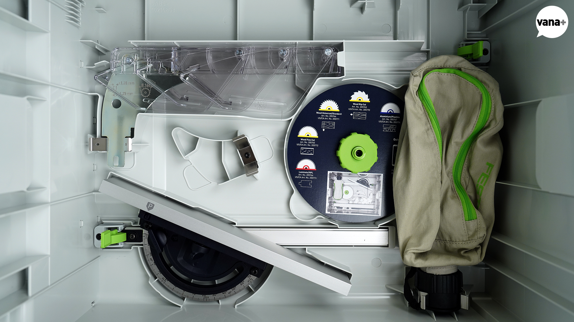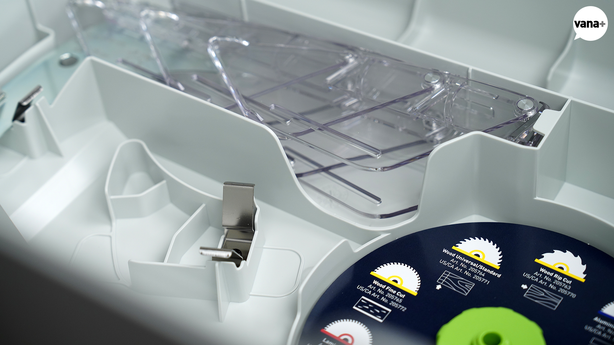 실제로는 테이블 쏘에 끼워져 있는 그루브 절단 웨지나 평행 사이드 펜스, 원형 톱날까지 전부 고정 수납이 가능한 엄청난 정리 박스.