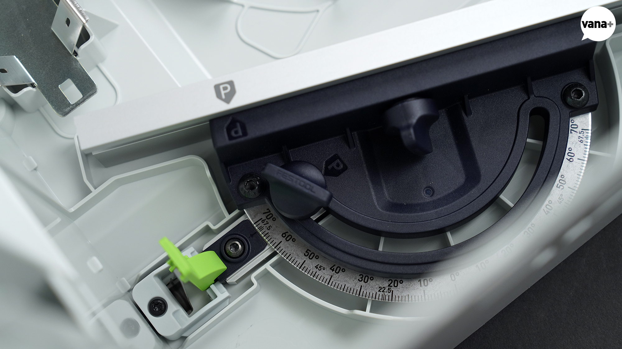 넓은 쪽 홈에는 마이터 펜스(Miter Fence)를 끼워 고정할 수 있어 평행 사이드 펜스와 정확한 수직, 혹은 -70° ~ +70° 범위 내에서의 정밀한 커팅이 가능하다.