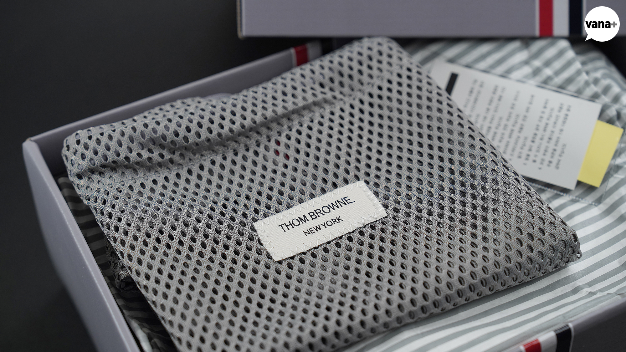 박스를 열면 구멍이 숭숭 뚫린 신발주머니가 보이고, 그 아래로 톰 브라운스러운 스트라이프 속지에 스니커즈가 얌전히 덮여 있다.