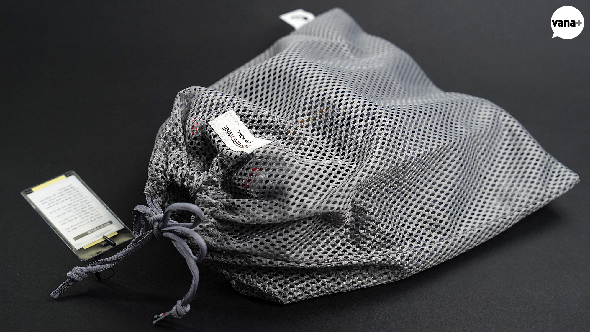 구성품으로는 메시 소재의 신발주머니 외에 여분의 슈레이스 한 쌍이 포함되어 있다.
