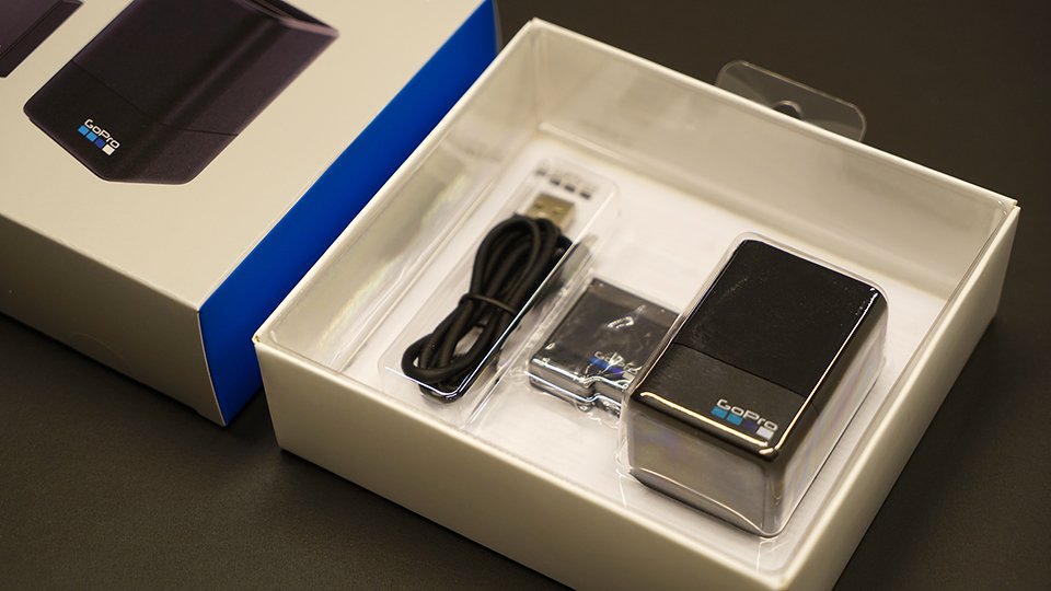 구성은 충전기 본체, 히어로5용 배터리 1개, USB-C 케이블.