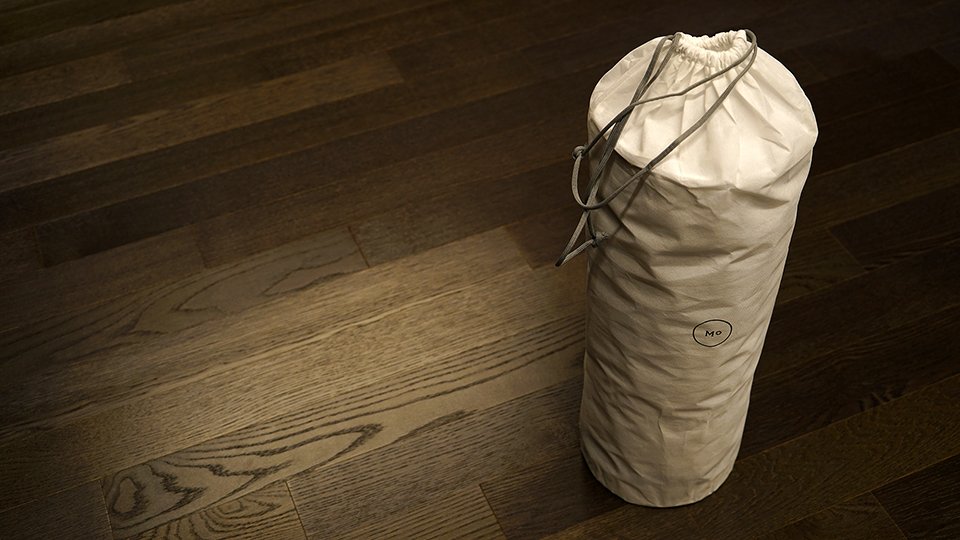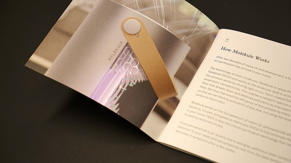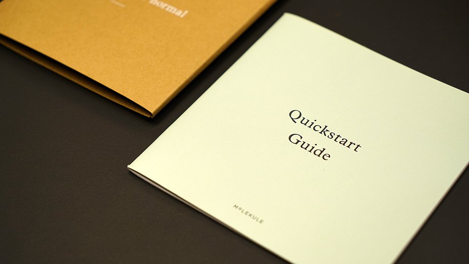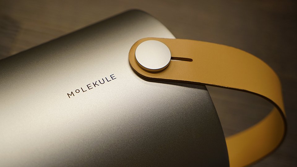 옆면에 세로로 새겨진 Molekule 산세리프 로고타입.