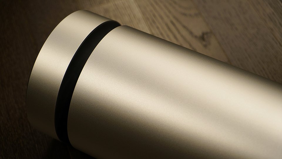 플라스틱 재질의 흰색 상판과 알루미늄 재질의 원통형 본체,