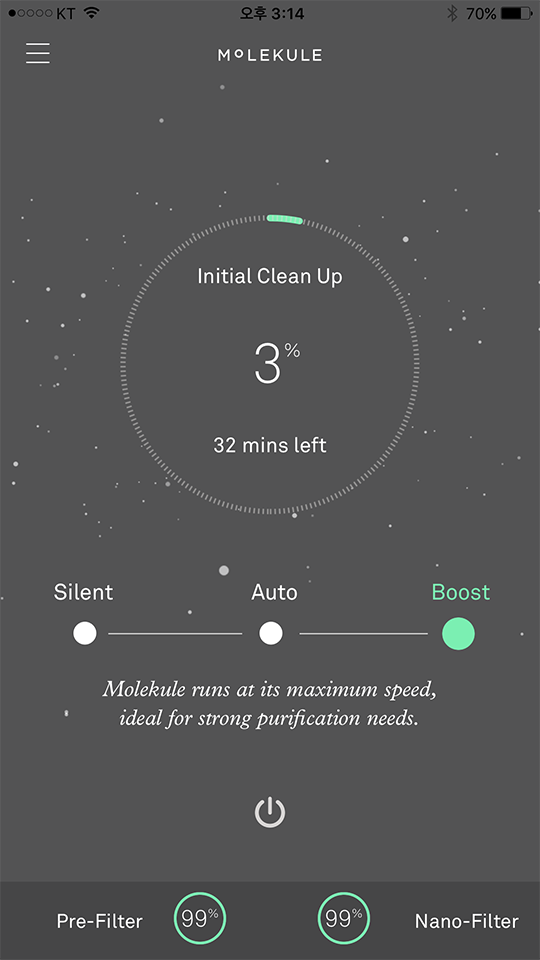 전용 App을 통해 처음 Boost 모드로 공기정화를 시작하는 모습.