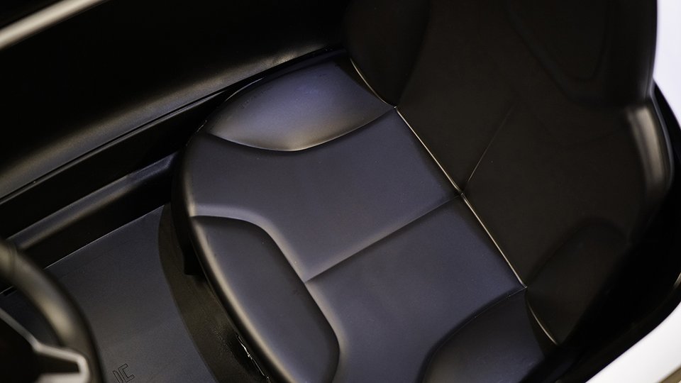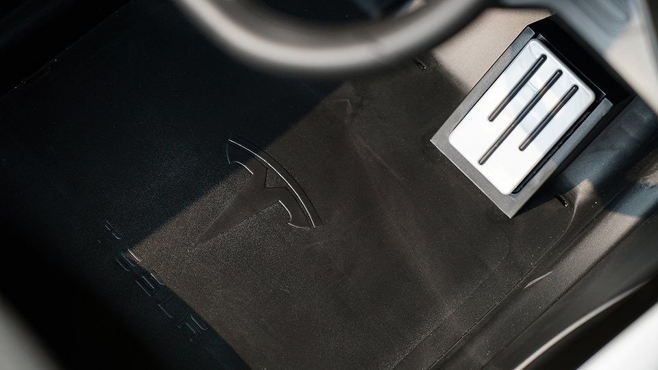 네모 반듯한 액셀러레이터와 테슬라 로고가 박힌 바닥 패드.
