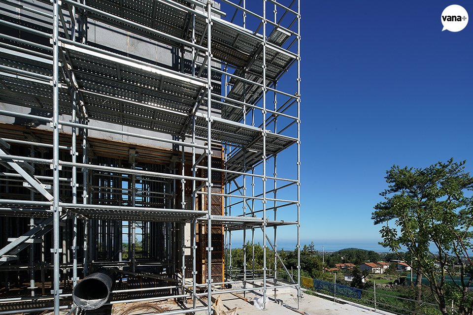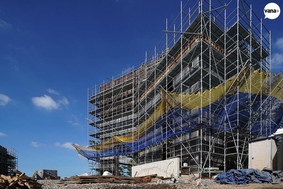 실제 건물 외곽으로 시스템 비계가 올라가 있기 때문에 조금 더 부피가 커 보이는 상태인데