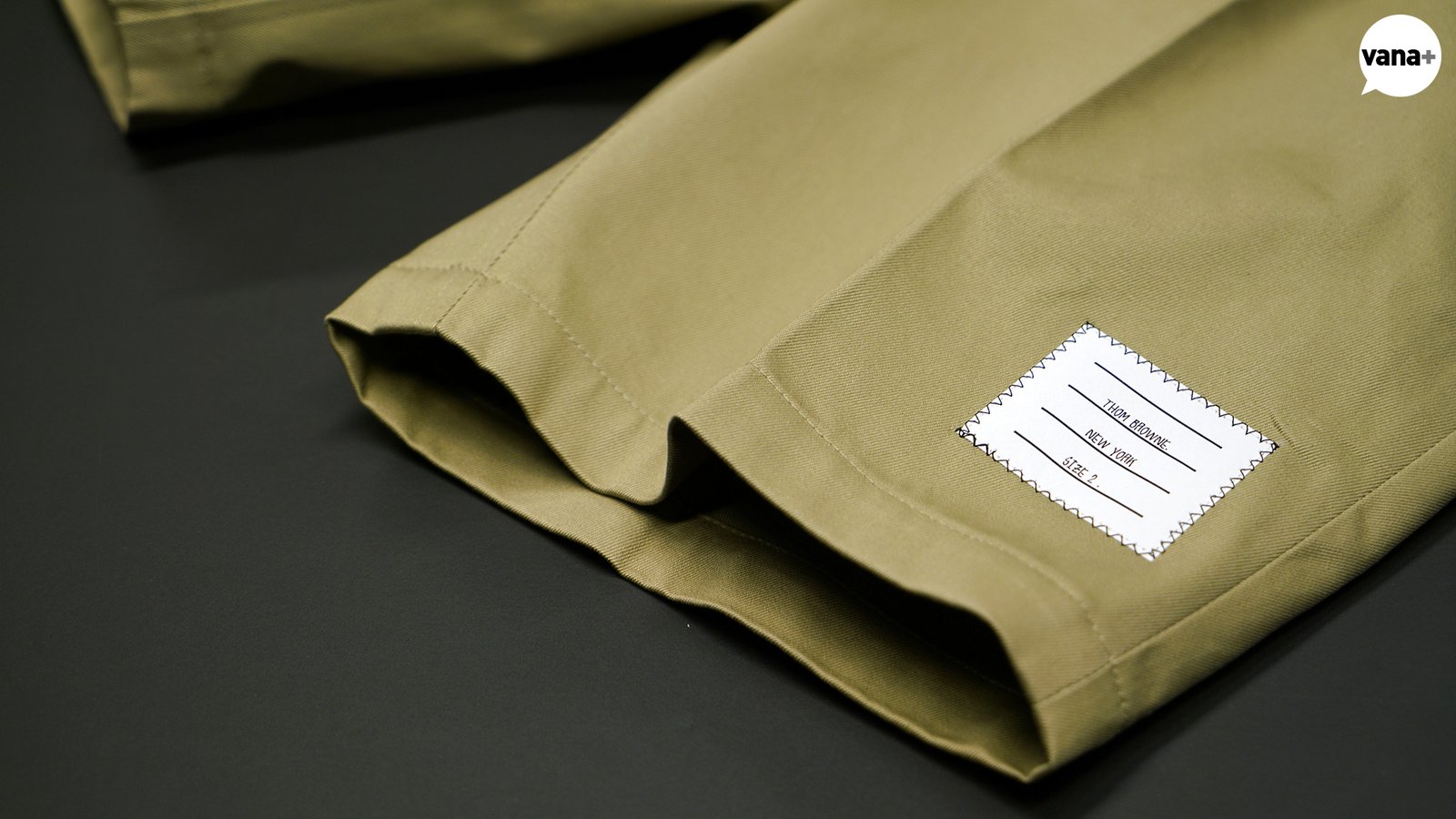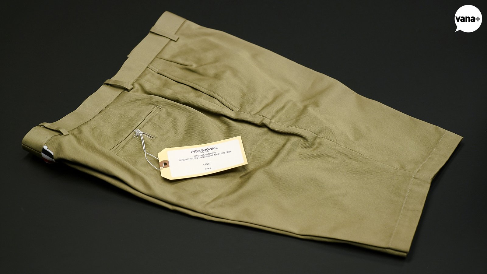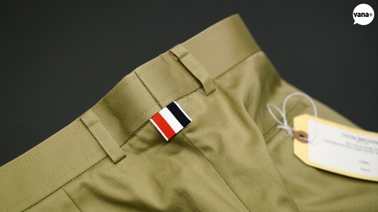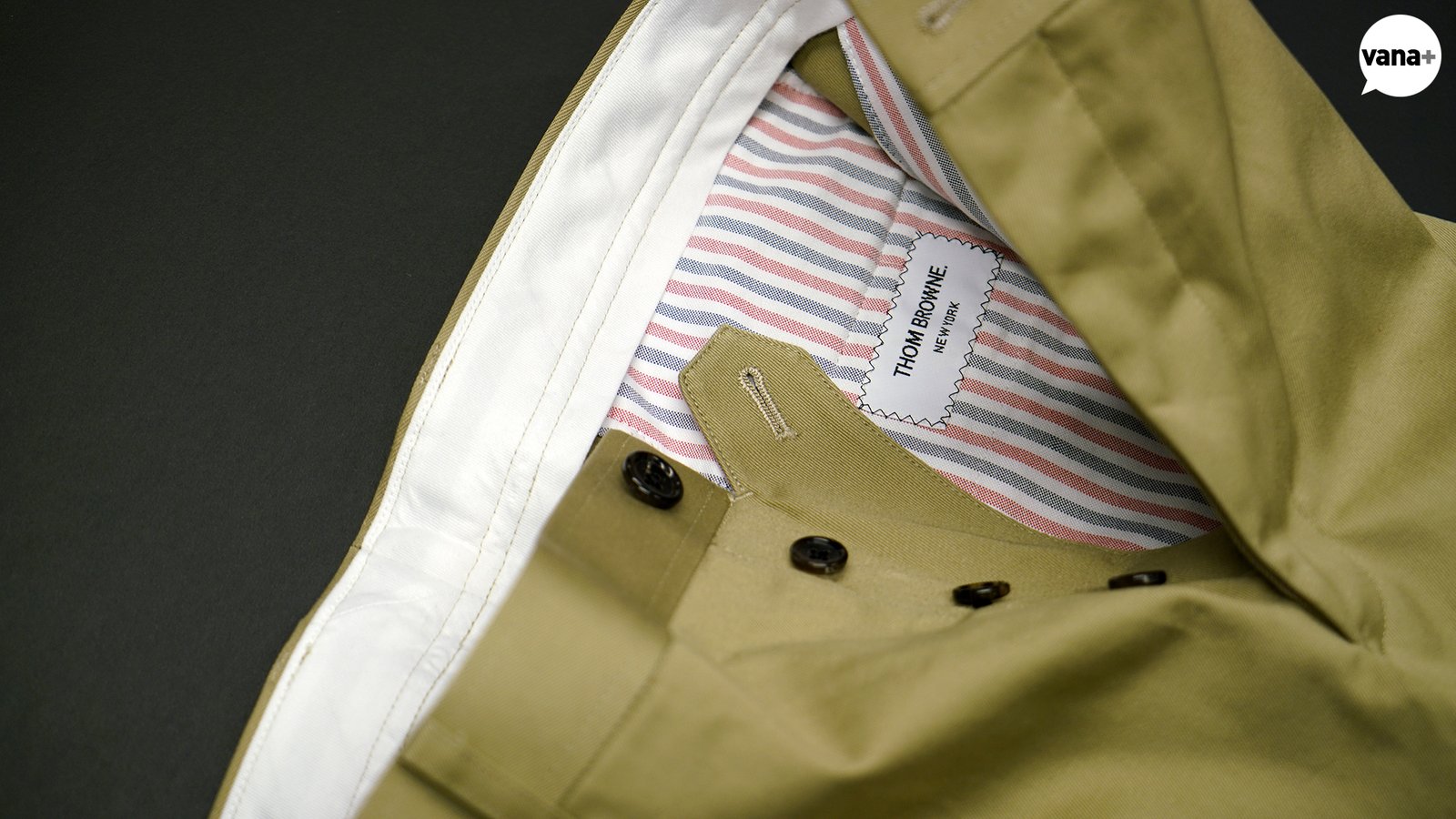 톰 브라운의 기본 스타일이지만 버튼 플라이 여밈 스타일에 뻣뻣한 코튼 소재 치노 팬츠.
