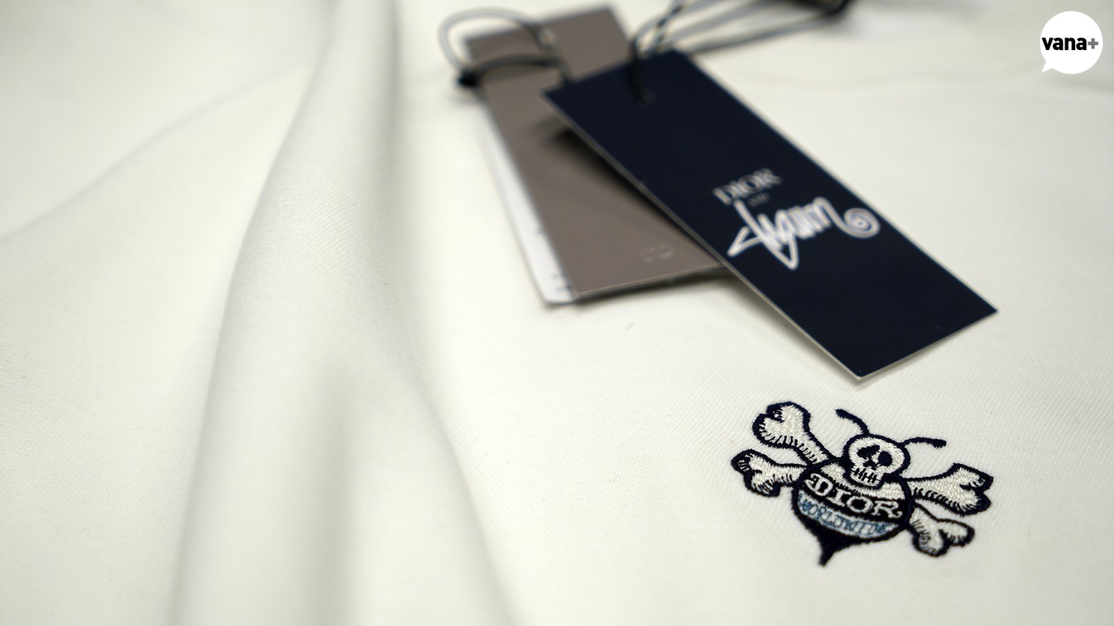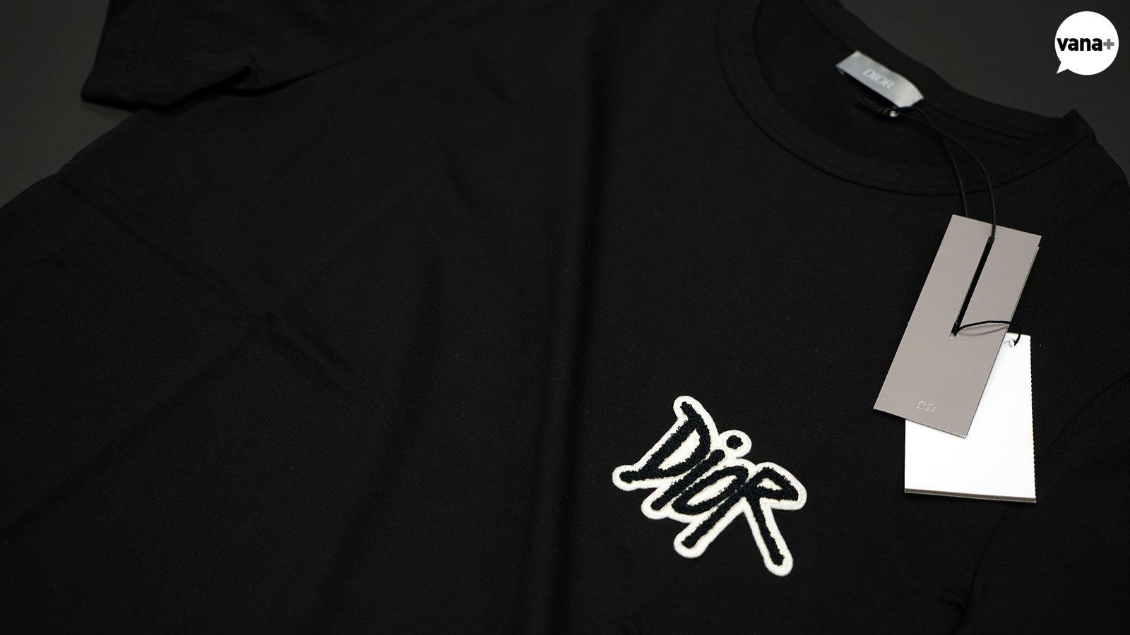 숀 스투시의 그래피티 스타일로 대소문자가 섞여 쓰여진 DioR 이라는 글씨가 부클레(boucle) 직물로 자수되어 있는 티셔츠.